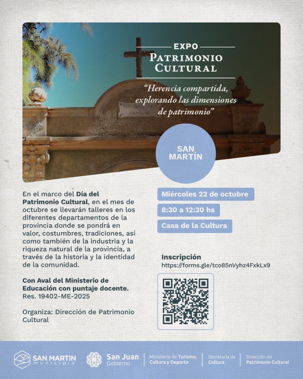 La Municipalidad de San Martín invita a participar de la Expo Patrimonio Cultural, bajo el lema “Herencia compartida, explorando las dimensiones de patrimonio”.