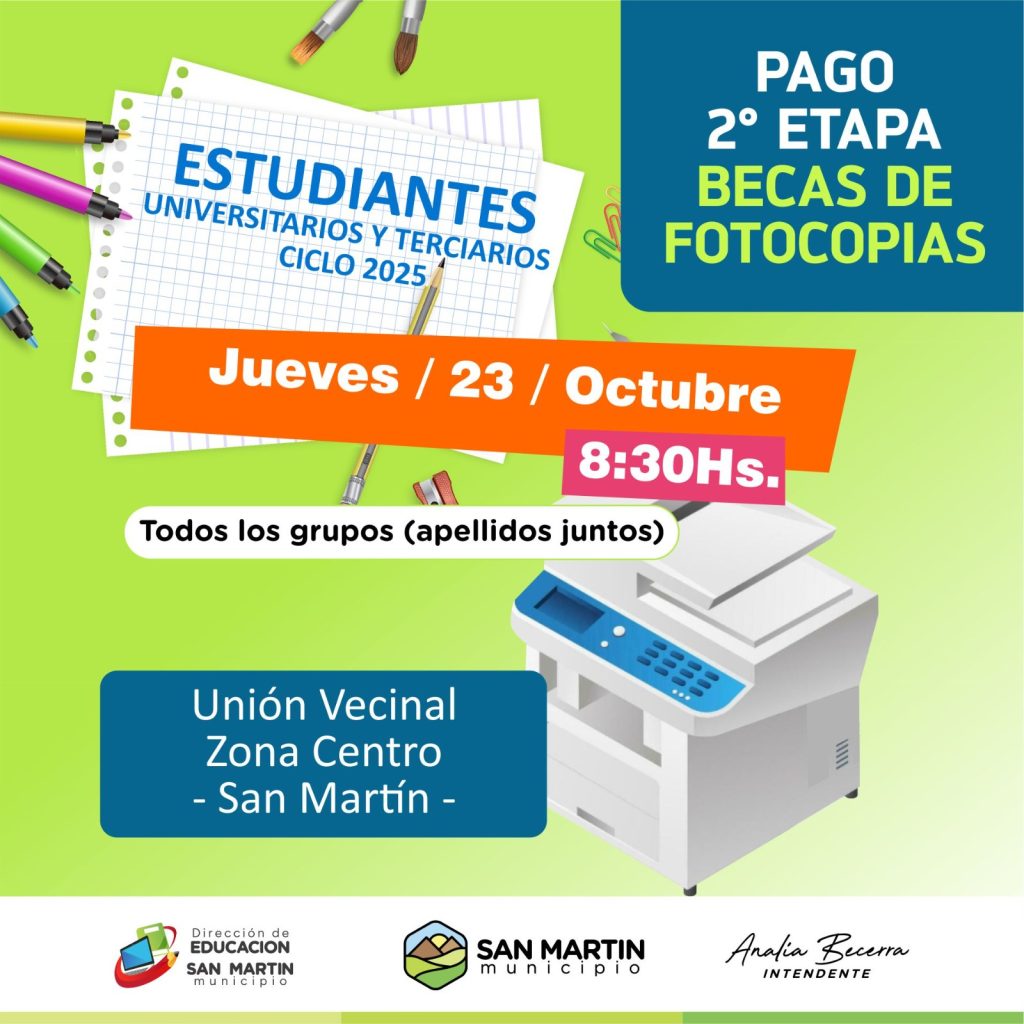 La Municipalidad de San Martín informa que este jueves 23 de octubre, a las 8:30 hs, se llevará a cabo el pago correspondiente a la segunda etapa del programa de Becas de Fotocopias, destinado a estudiantes universitarios y terciarios del departamento.