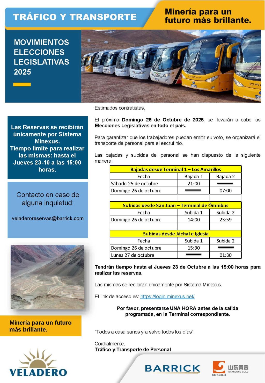 Con motivo de las Elecciones Legislativas Nacionales, que se llevarán a cabo el domingo 26 de octubre de 2025, la mina Veladero anunció la organización de un operativo especial de transporte para garantizar que todos los trabajadores puedan emitir su voto.