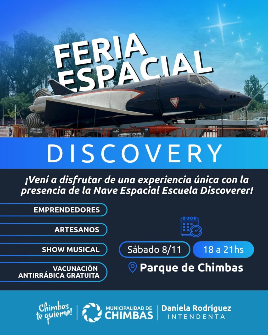 Este sábado 8 de noviembre, el Parque de Chimbas se convertirá en escenario de una experiencia fuera de este mundo. La Municipalidad de Chimbas, junto a la intendenta Daniela Rodríguez, invita a disfrutar de la Feria Espacial Discovery, un evento para toda la familia que promete sorprender a grandes y chicos.