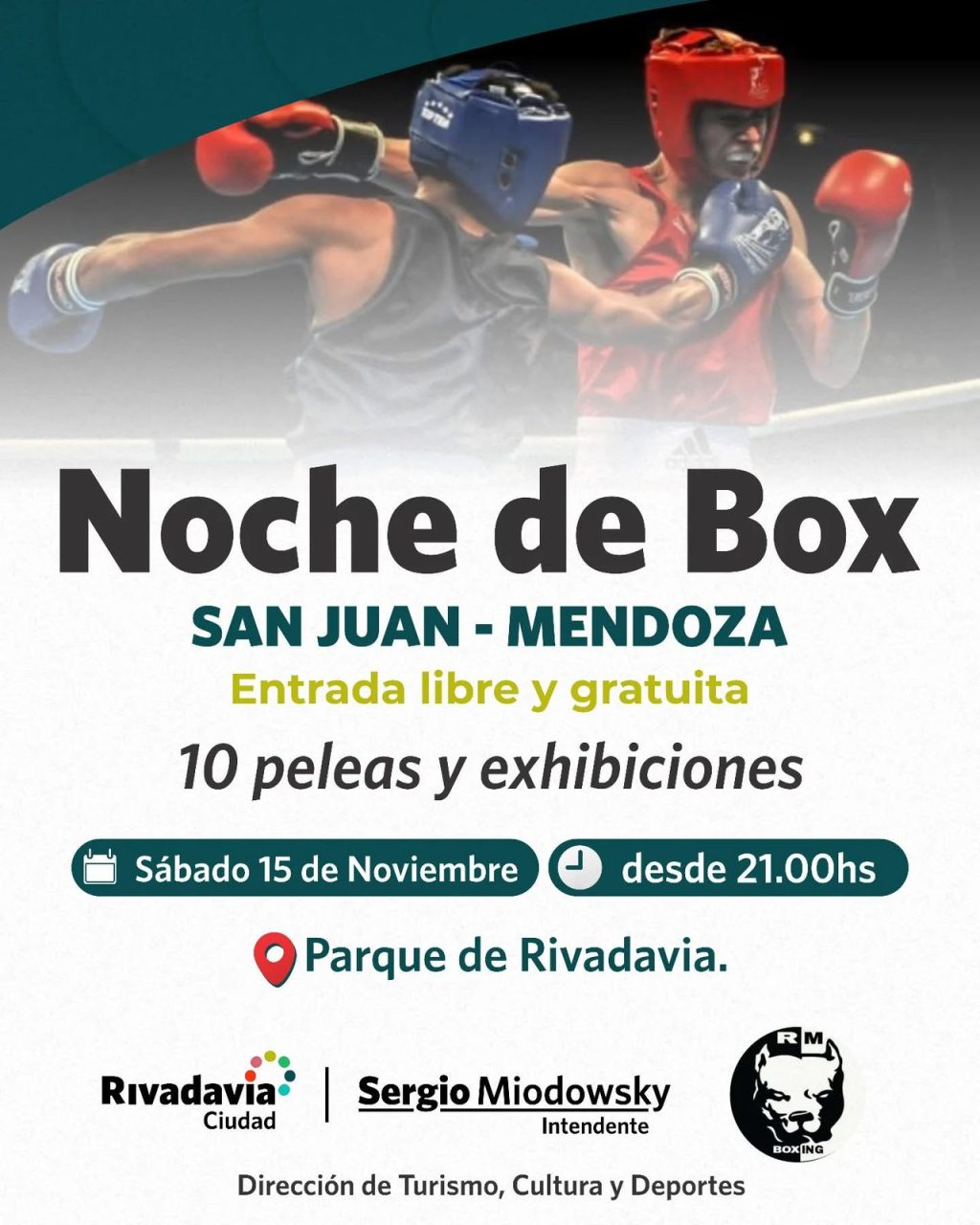El próximo sábado 15 de noviembre, el Parque de Rivadavia será escenario de una gran Noche de Box que reunirá a representantes de San Juan y Mendoza en un evento deportivo único y con entrada libre y gratuita.
