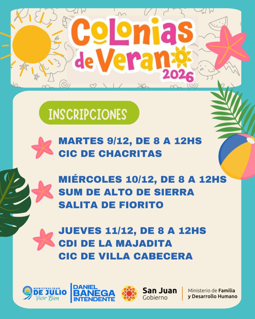 La Municipalidad de 9 de Julio comunica que desde el martes 9 al jueves 11 de diciembre se realizará el período de inscripciones para las Colonias de Verano 2026, destinadas a niños, adultos mayores y personas con discapacidad del departamento.