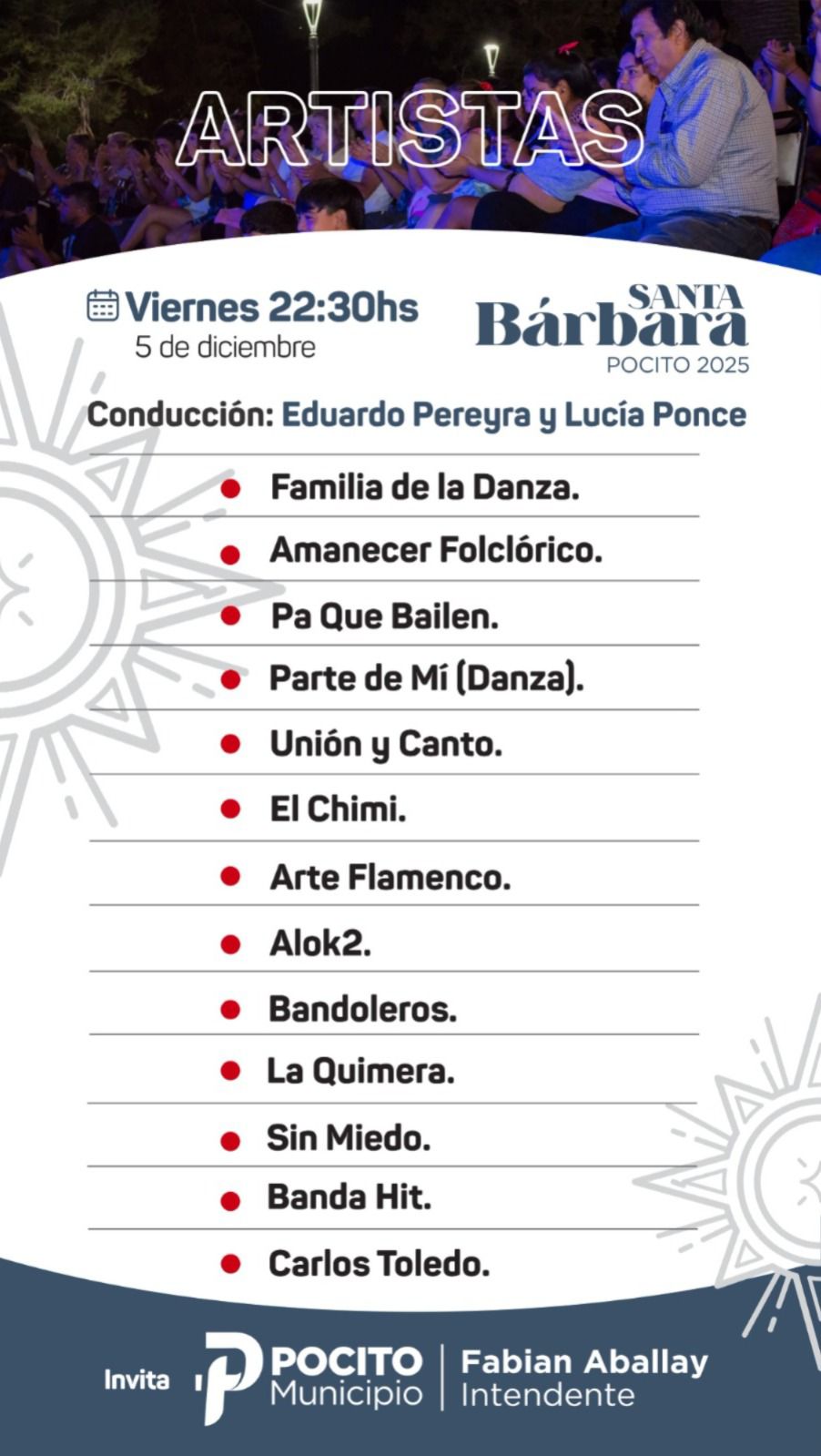 «Con gran alegría vivimos esta primer noche de la Fiesta de Santa Bárbara», dijo el intendente Fabian Aballay, que previo al espectáculo artístico participó de la celebración de la Misa y la Procesión de Antorchas, en el día de la Patrona de Pocito y en el marco de la Novena que comenzó el viernes 29.