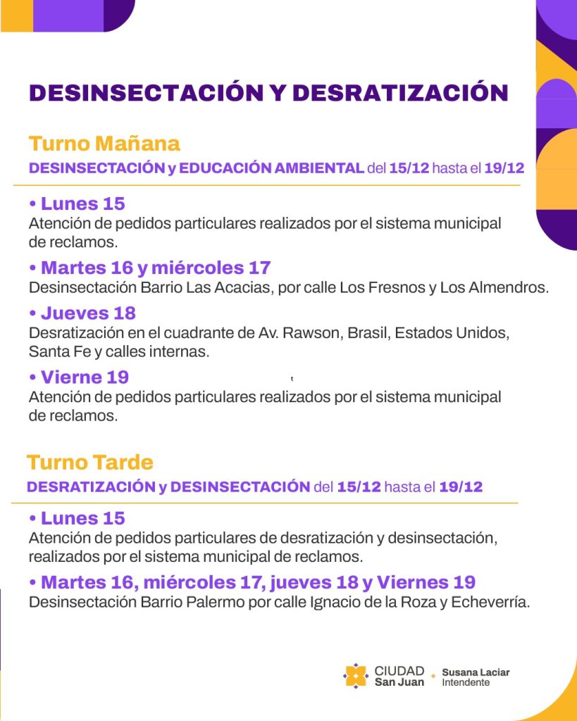 La Municipalidad de la Ciudad de San Juan informa el cronograma semanal de tareas de desinsectación, desratización y educación ambiental, que se llevarán adelante desde el lunes 15 hasta el viernes 19 de diciembre en diversos sectores de la capital, tanto en respuesta a reclamos vecinales como mediante operativos programados.