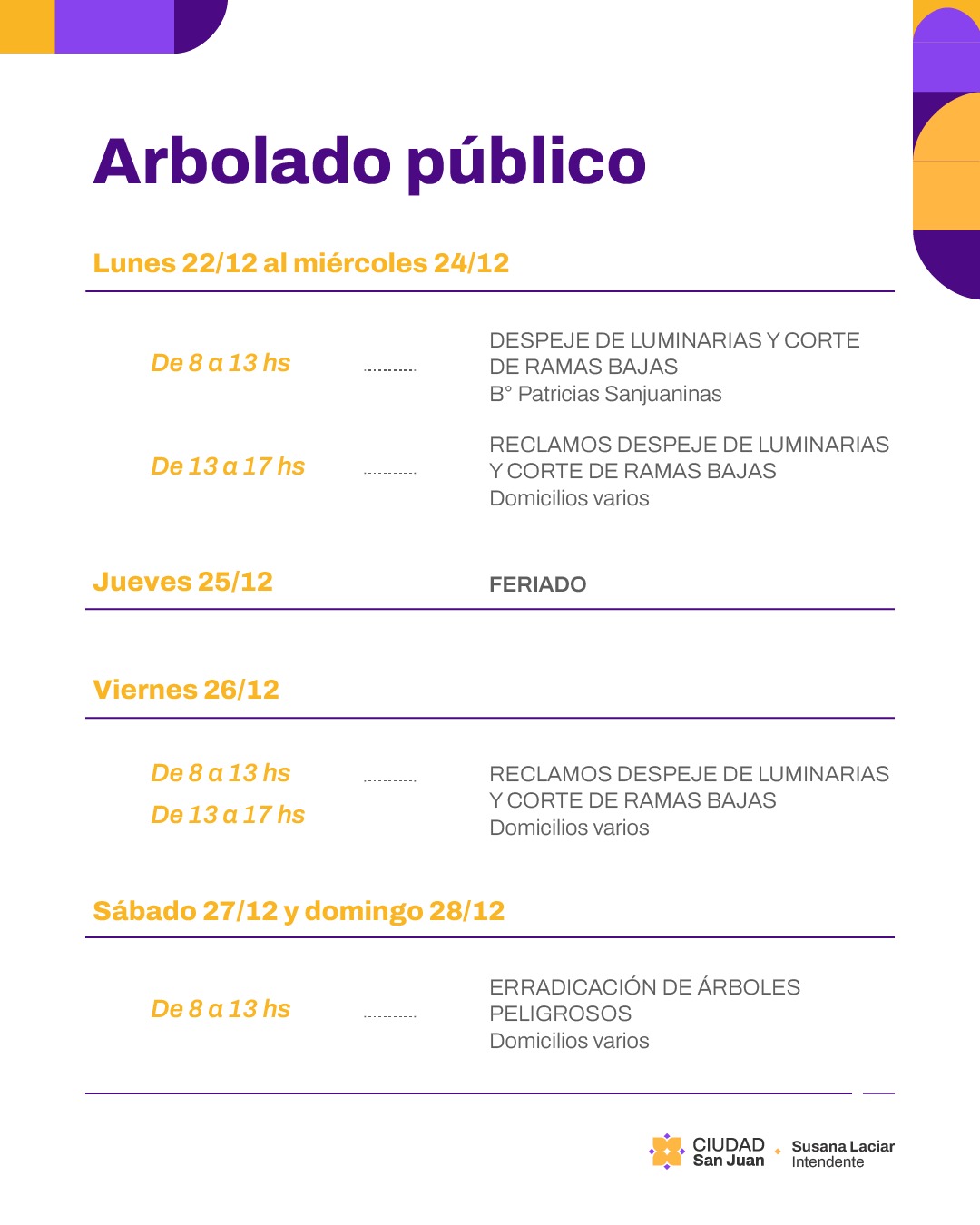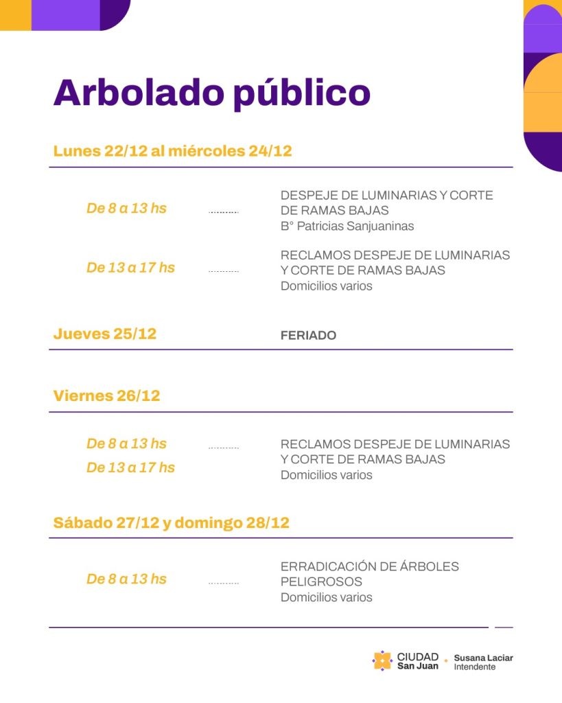La Municipalidad de la Ciudad de San Juan dio a conocer el cronograma de intervenciones sobre el arbolado público que se desarrollará entre el lunes 22 y el domingo 28 de diciembre, con acciones orientadas a mejorar la seguridad urbana y el correcto funcionamiento del alumbrado público.