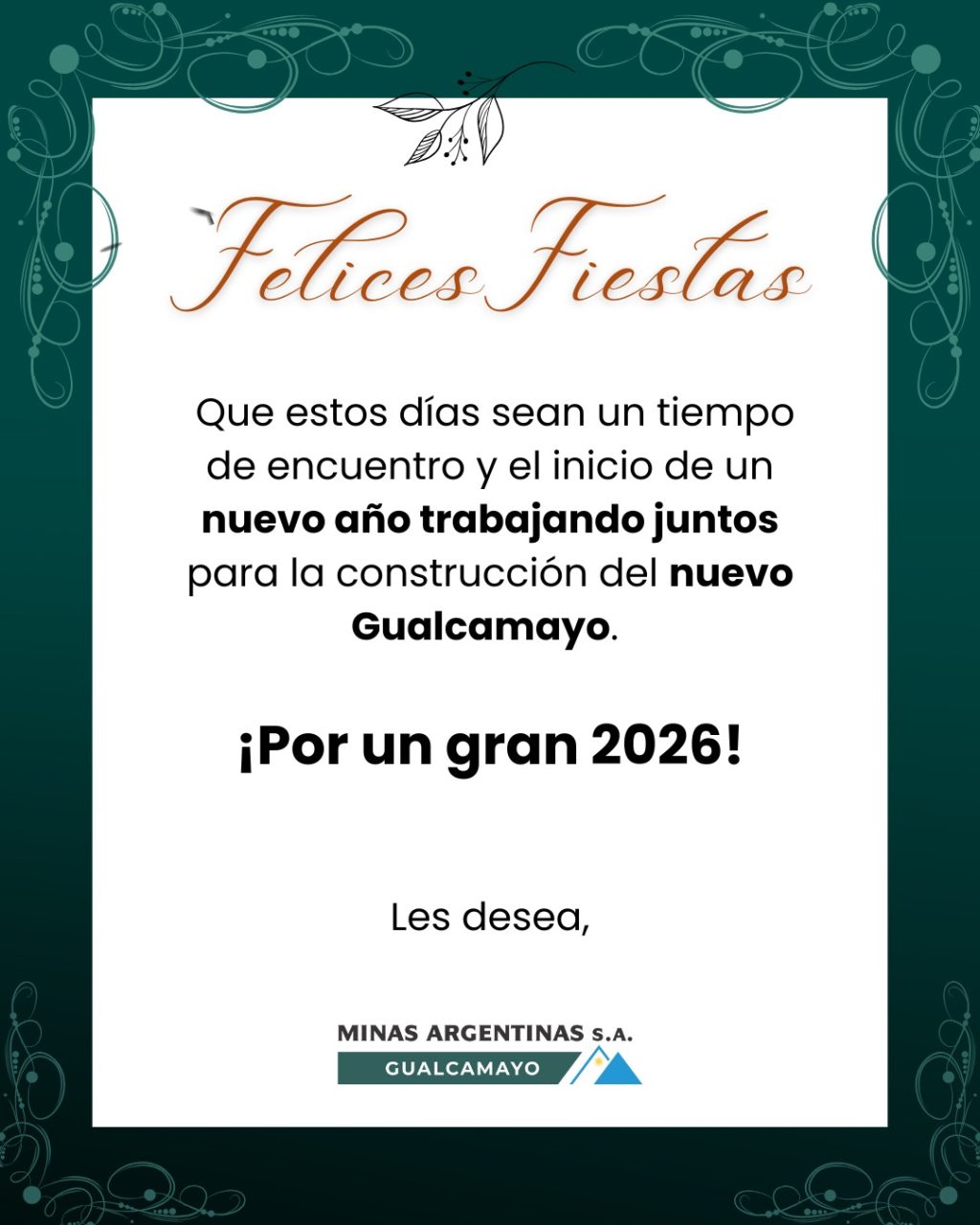 Minería FELICES FIESTAS! Diario Las Noticias 24 diciembre, 2025 1 min read Facebook WhatsApp Twitter LinkedIn Continue Reading Previous: Aprobaron el RIGI para mina de oro Gualcamayo en San Juan: u$s665 millones de inversiónNext: Cámara Minera de San Juan NOTICIAS RELACIONADAS Veladero 1 min read Minería Veladero 24 diciembre, 2025 Los Azules 1 min read Minería Los Azules 24 diciembre, 2025 Cámara Minera de San Juan 1 min read Minería Cámara Minera de San Juan 24 diciembre, 2025