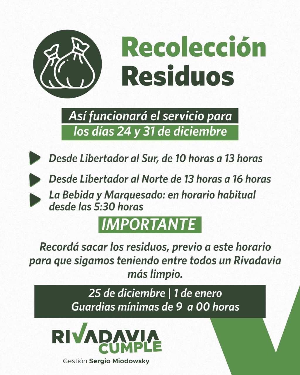 La Municipalidad de Rivadavia dio a conocer el esquema especial de recolección de residuos que se implementará durante los días 24 y 31 de diciembre, en el marco de las celebraciones de Navidad y Año Nuevo, con el objetivo de garantizar el normal funcionamiento del servicio y mantener la limpieza en todo el departamento.