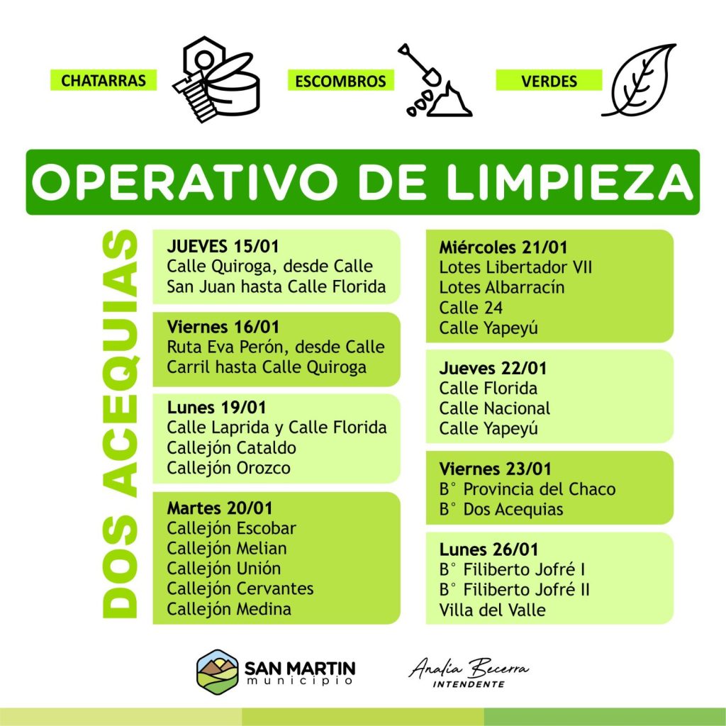 La Municipalidad de San Martín continúa llevando adelante el Operativo de Limpieza Integral en el distrito Dos Acequias, con trabajos organizados de recolección de chatarras, escombros y residuos verdes en distintos sectores de la zona.