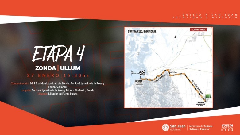 La carrera de este martes 27 de enero será la contrarreloj individual y largará a las 15:30 horas, desde Municipalidad de Zonda.