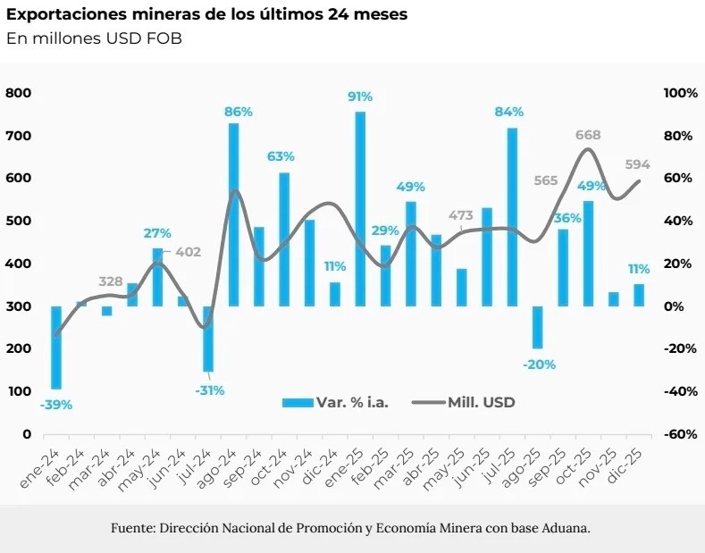 Dados estos montos, las exportaciones de productos mineros significaron el 9,0% de las exportaciones totales argentinas en diciembre de 2025 y el 7,0% en el