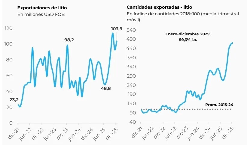Para el caso del litio, en diciembre se exportaron un total de USD 104 millones, lo que implicó un crecimiento