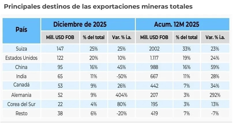 Suiza, Estados Unidos, China y India explicaron en diciembre el 72% (USD 429 millones) de los destinos de las exportaciones mineras totales, mientras que en el acumulado del año este porcentaje alcanzó el 79% (USD 4.774 millones) para los países seleccionados.