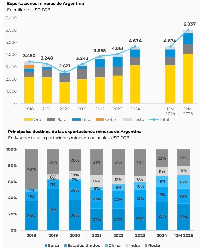 La minería argentina exportó USD 6.037 millones en 2025 con lo que esta industria representó 9,0% de las exportaciones totales de la economía nacional.