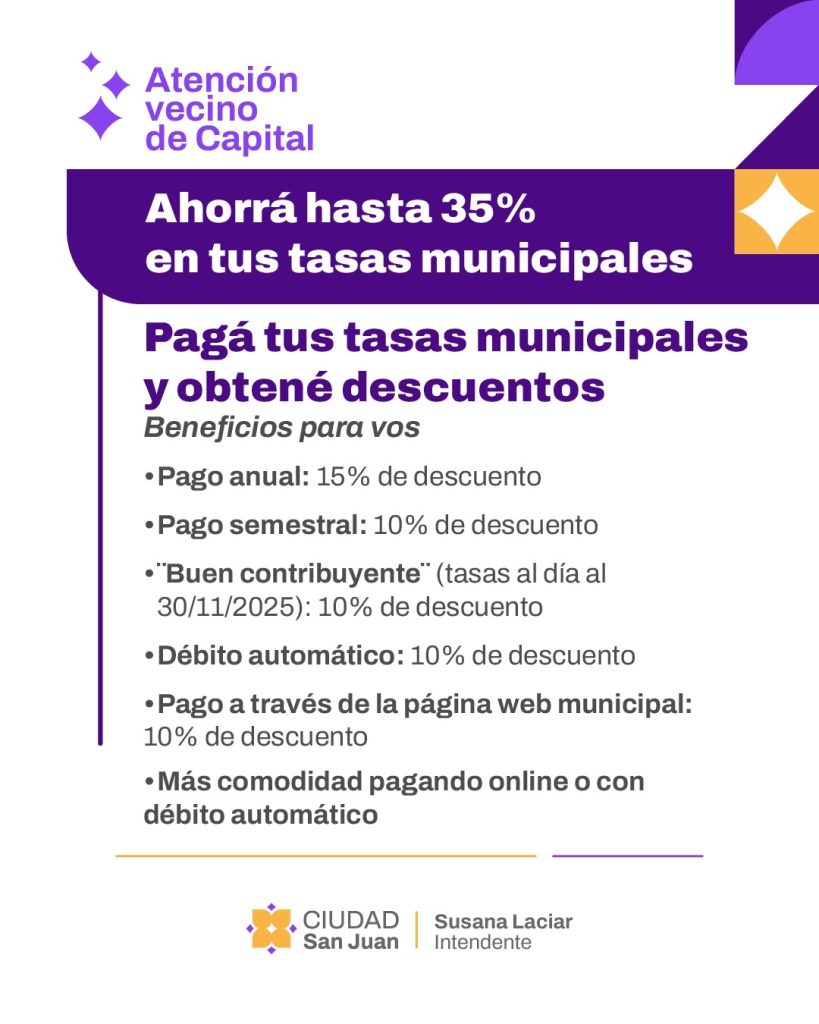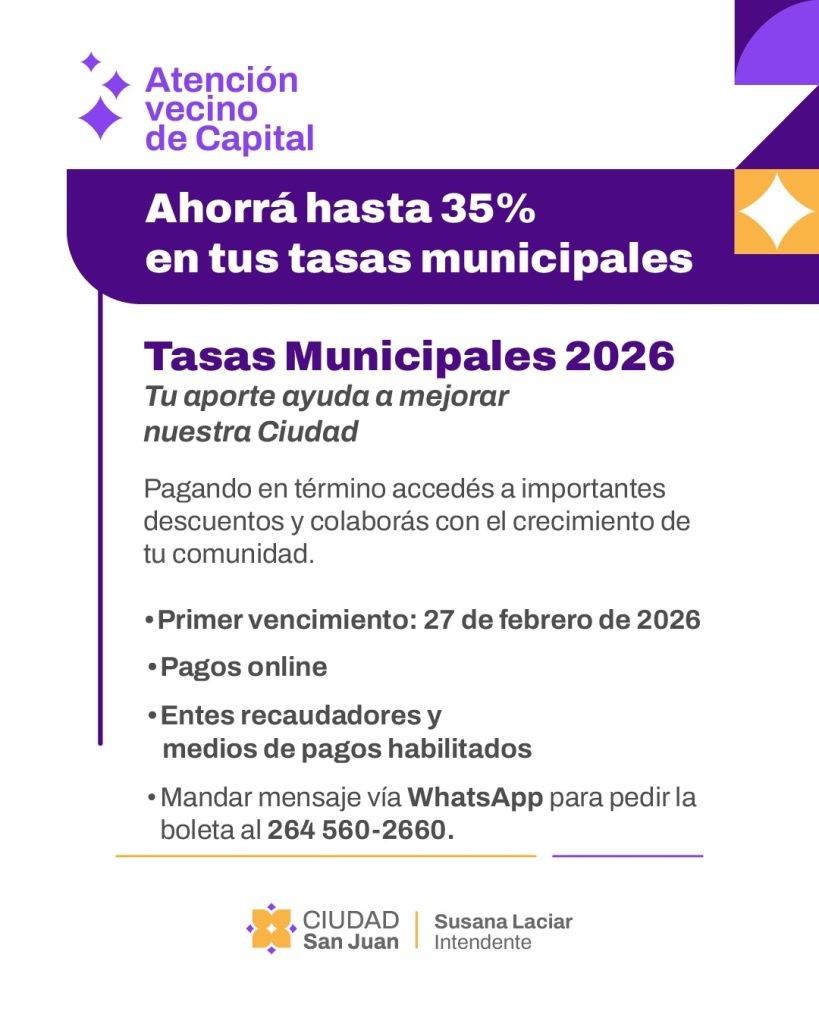 La Municipalidad de la Ciudad de San Juan, a través de la Secretaría de Economía y Hacienda, comunica que ya se encuentra vigente el esquema de Tasas Municipales 2026, que ofrece descuentos acumulables de hasta el 35% para los vecinos de Capital que abonen en término y utilicen las distintas modalidades de pago disponibles.