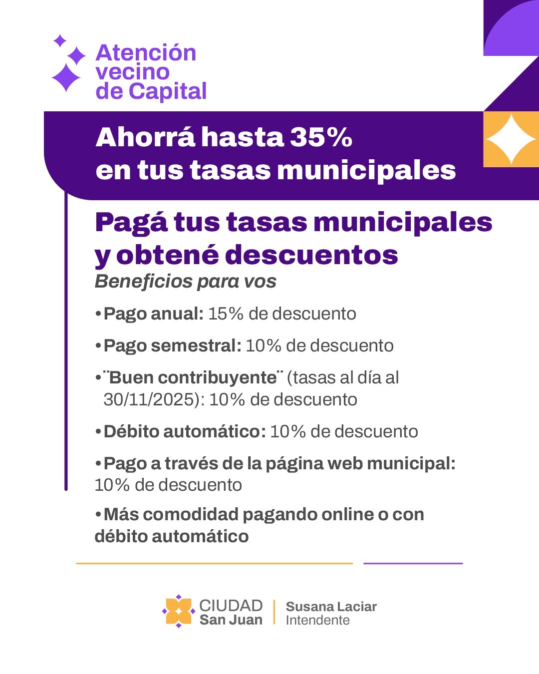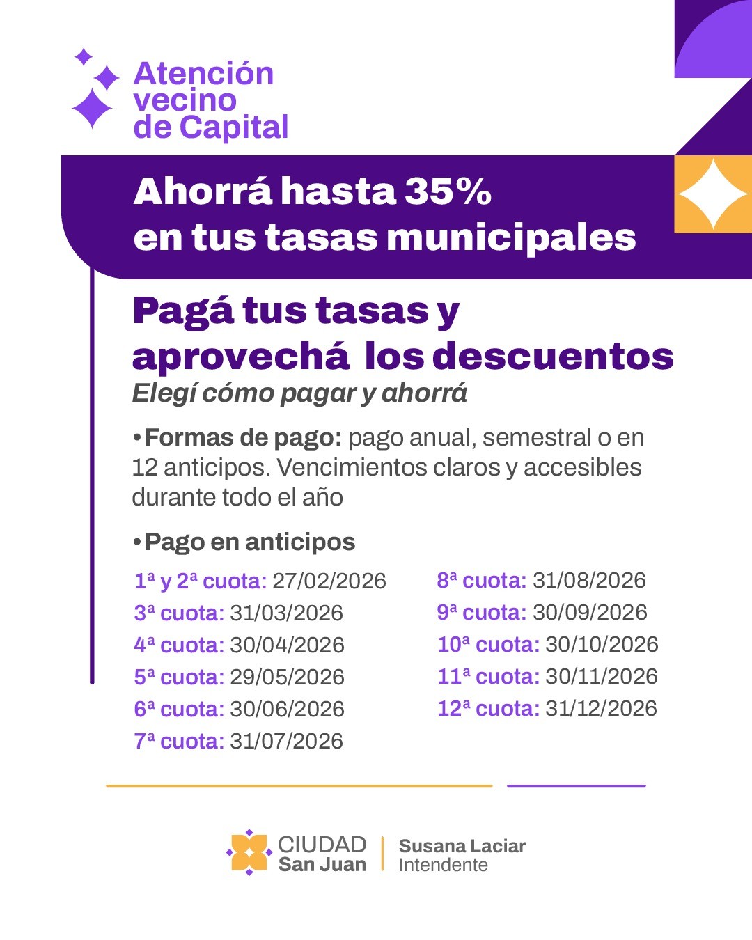 La Municipalidad de la Ciudad de San Juan, a través de la Secretaría de Economía y Hacienda, comunica que ya se encuentra vigente el esquema de Tasas Municipales 2026, que ofrece descuentos acumulables de hasta el 35% para los vecinos de Capital que abonen en término y utilicen las distintas modalidades de pago disponibles.