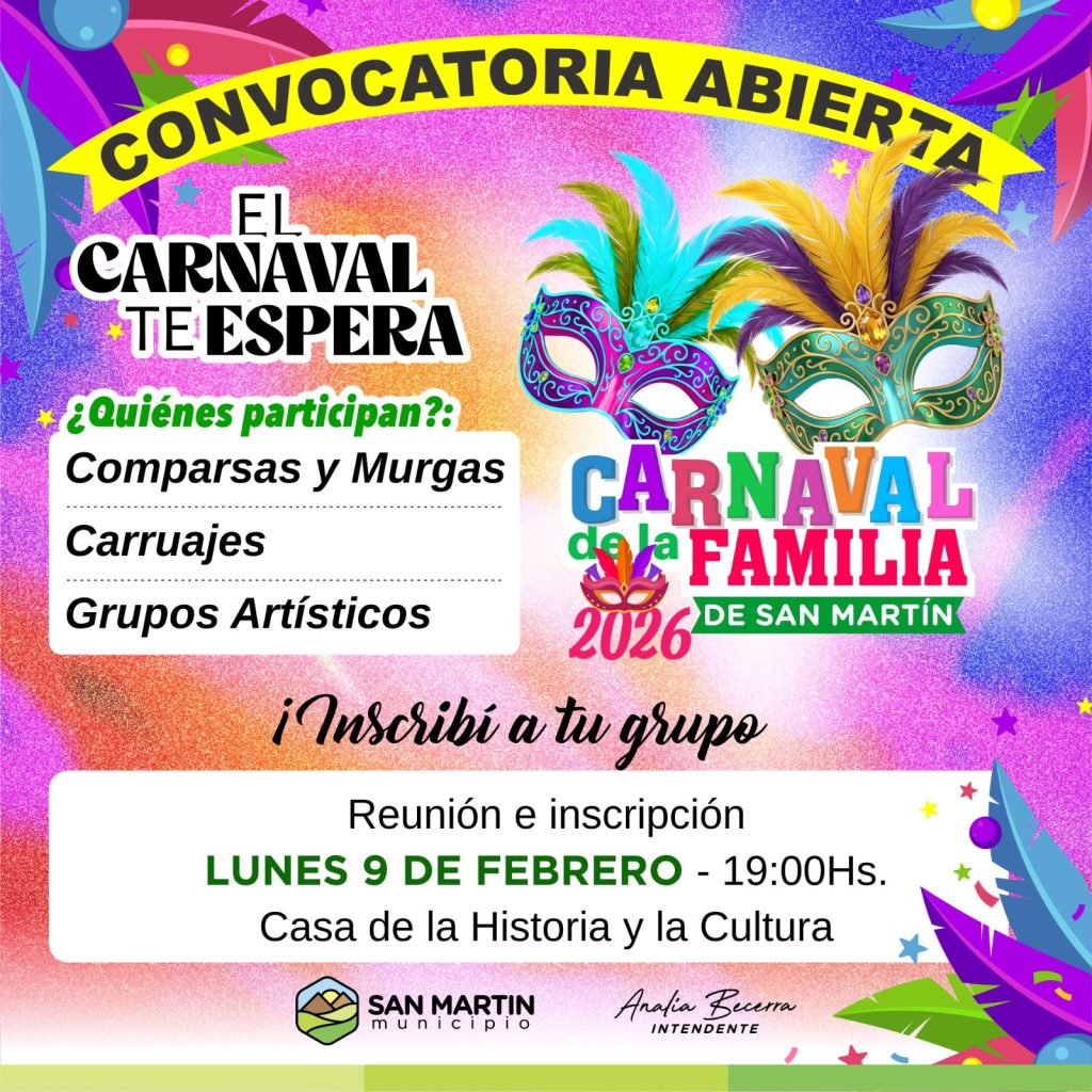 Desde el Municipio se invita a todos los grupos interesados a participar y ser protagonistas del Carnaval de la Familia 2026, una celebración que sigue creciendo y consolidando como un espacio de participación para toda la comunidad sanmartiniana.