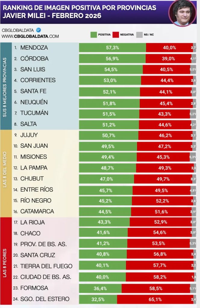 Según los datos publicados, San Juan quedó dentro del grupo de distritos con balance positivo, superando el promedio nacional y manteniéndose por encima de varias provincias de peso demográfico. En el caso sanjuanino, la imagen negativa de Milei se ubicó en el 47,2%, mientras que el resto de los encuestados manifestó no tener una posición definida.