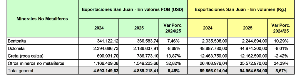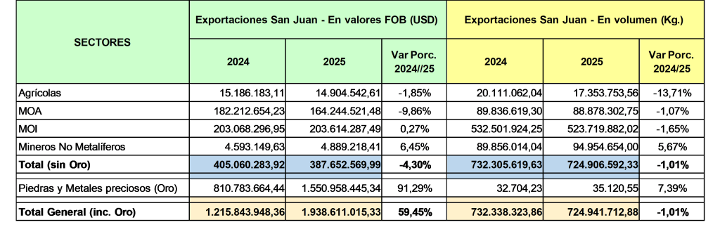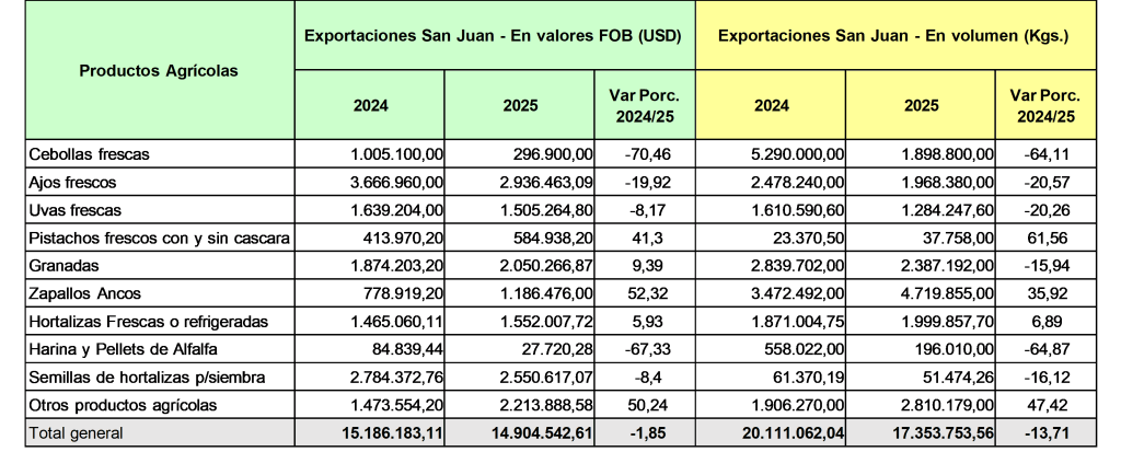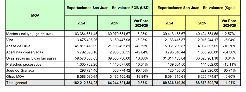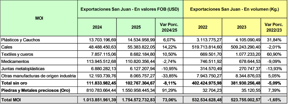 El presente análisis de la evolución de las exportaciones de productos tradicionales de la oferta exportable de San Juan, compara los 12 (doce) meses del año 2024 con los 12 (doce) meses 2025.