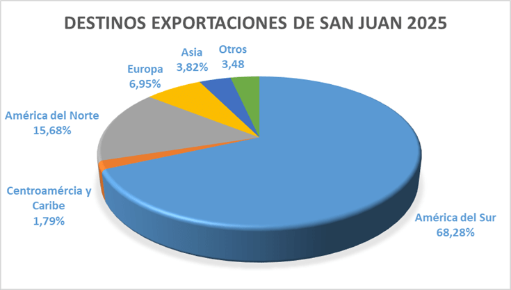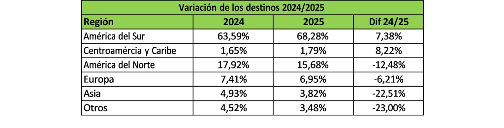 Observando los mercados de destino de nuestra oferta exportable en los años 2024 y 2025, se infiere en importancia que el 68,28% de las exportaciones de este periodo se mantuvieron dirigidas a América del Sur; el 15,68% a América del Norte, y un 6,95% a Europa.