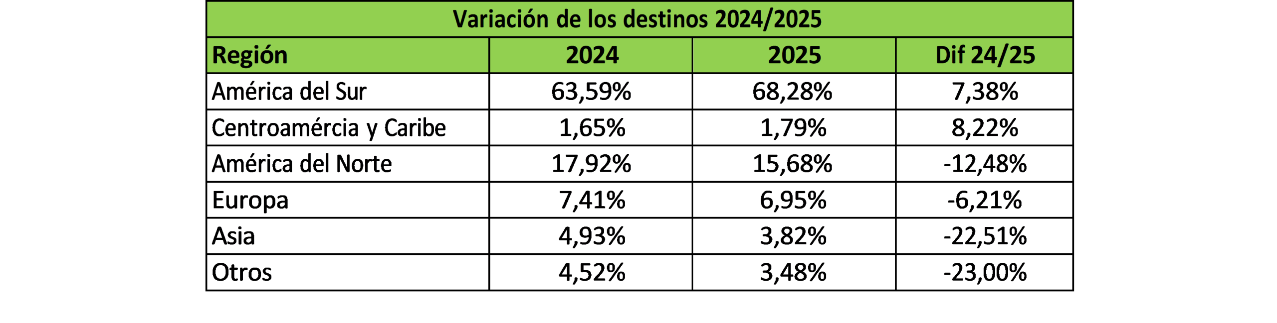 Observando los mercados de destino de nuestra oferta exportable en los años 2024 y 2025, se infiere en importancia que el 68,28% de las exportaciones de este periodo se mantuvieron dirigidas a América del Sur; el 15,68% a América del Norte, y un 6,95% a Europa.