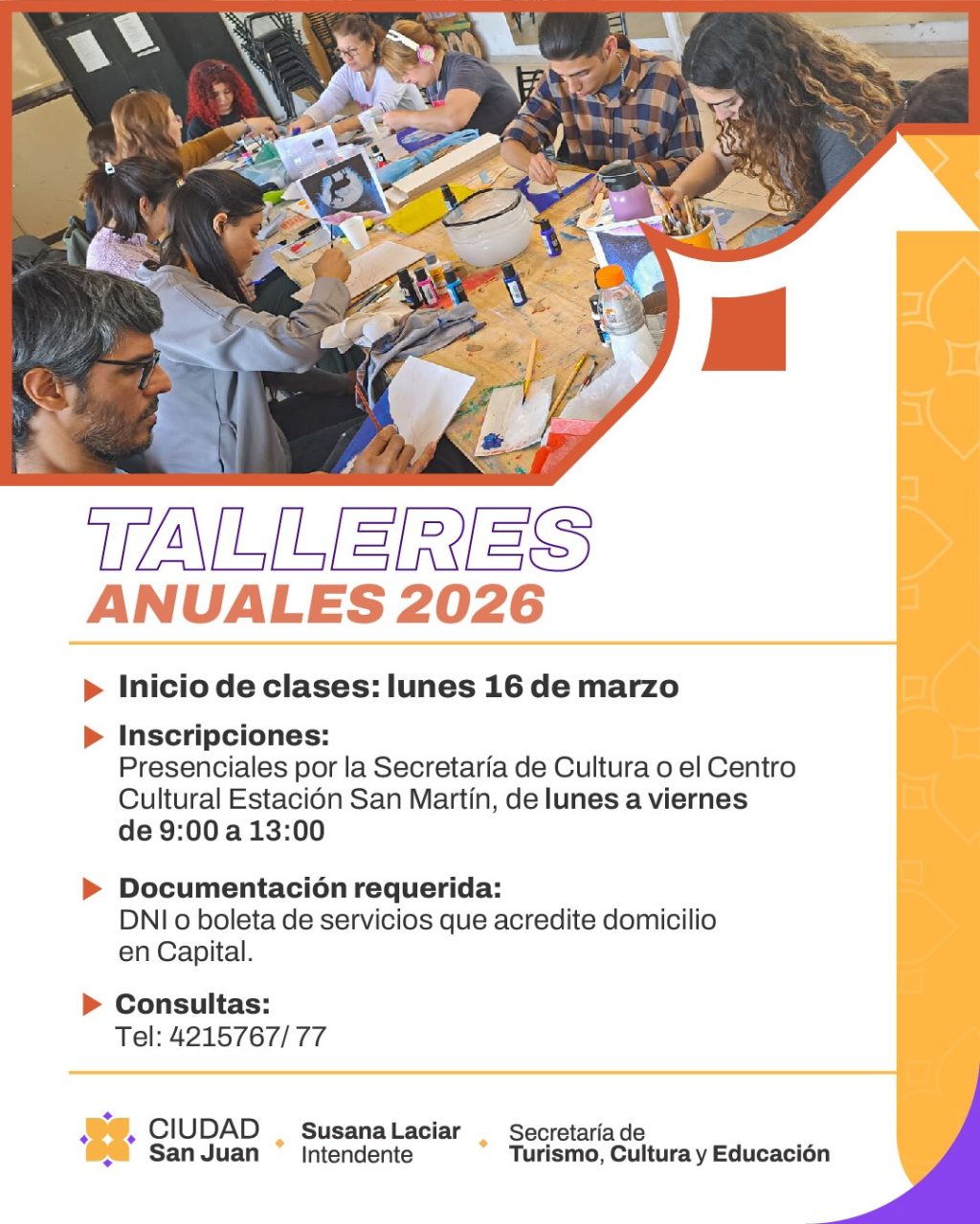 La Municipalidad de la Ciudad de San Juan, a través de su Secretaria de Turismo, Cultura y Educacion informa que el lunes 16 de marzo comenzarán los Talleres Anuales 2026.