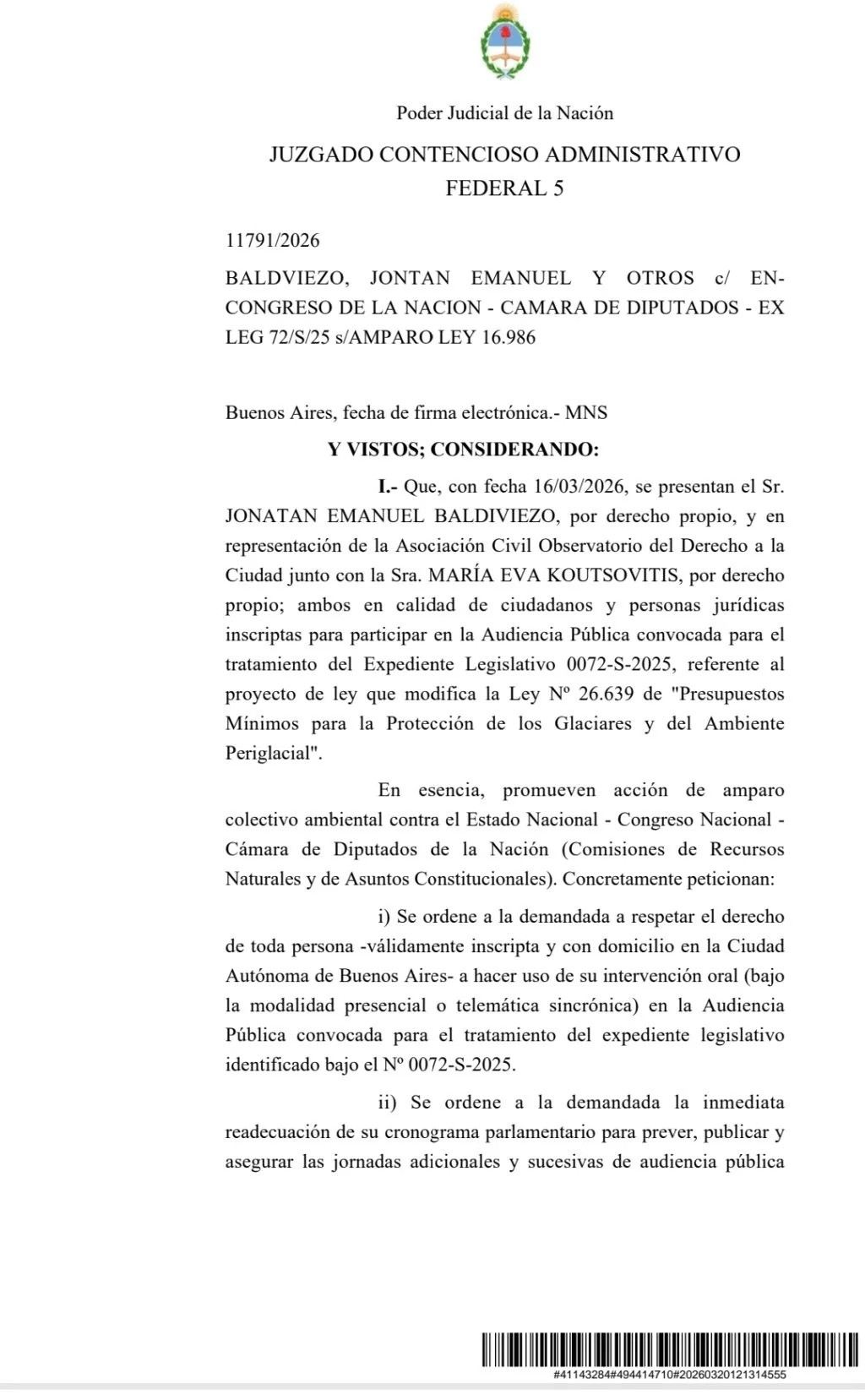 “JONATAN EMANUEL BALDIVIEZO, por derecho propio, y en representación de la Asociación Civil Observatorio del Derecho a la Ciudad junto con la Sra. MARÍA EVA KOUTSOVITIS” respondió el Juzgado, “en esencia, promueven acción de amparo colectivo ambiental contra el Estado Nacional -Congreso Nacional-