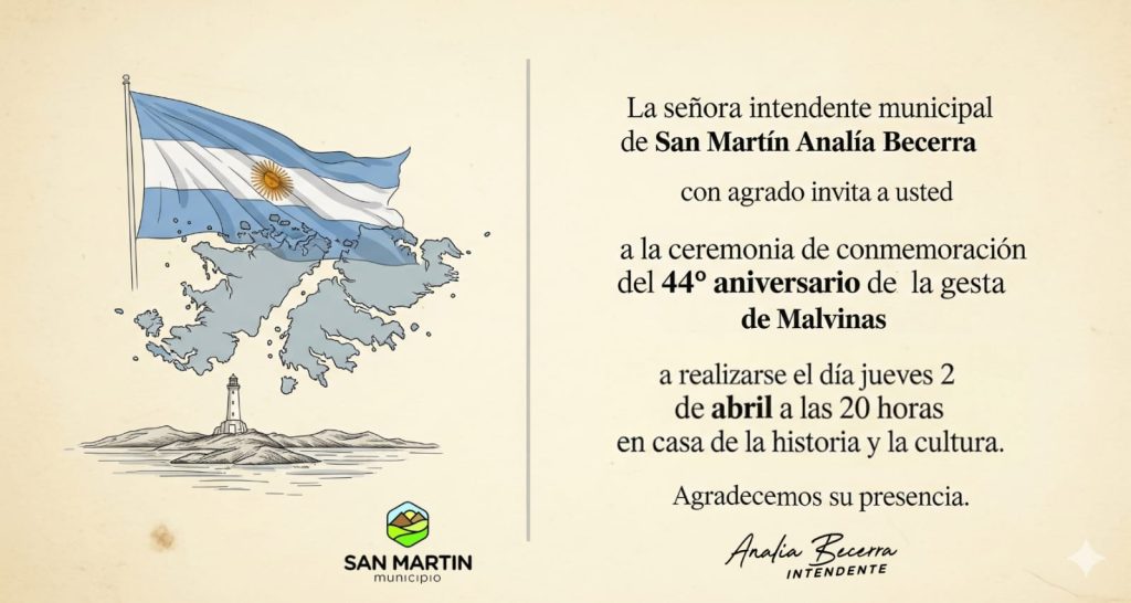 En el marco del 44° aniversario de la Gesta de Malvinas, la Municipalidad de San Martín invita a la comunidad a participar de la ceremonia conmemorativa, un espacio de encuentro y reflexión en honor a nuestros héroes.
