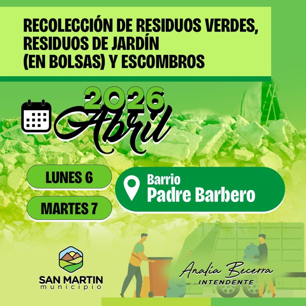 La Municipalidad de San Martín informa a los vecinos y vecinas del Barrio Padre Barbero que los días lunes 6 y martes 7 de abril se llevará adelante un operativo especial de recolección de residuos verdes, restos de jardín (en bolsas) y escombros.