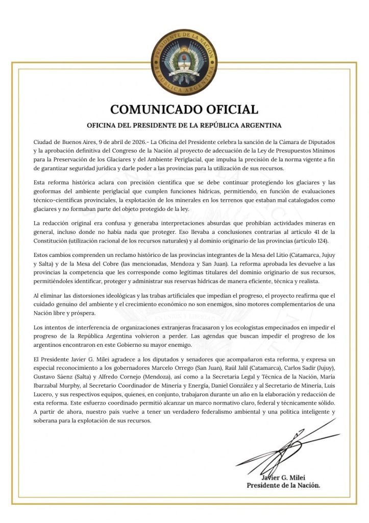 La Oficina del Presidente de la República Argentina difundió un comunicado oficial en el que celebró la sanción definitiva en el Congreso de la Nación del proyecto de adecuación de la Ley de Presupuestos Mínimos para la Preservación de los Glaciares y del Ambiente Periglacial. La medida, según el documento, busca dotar de mayor precisión a la normativa vigente, garantizando seguridad jurídica y fortaleciendo el rol de las provincias en la administración de sus recursos naturales.