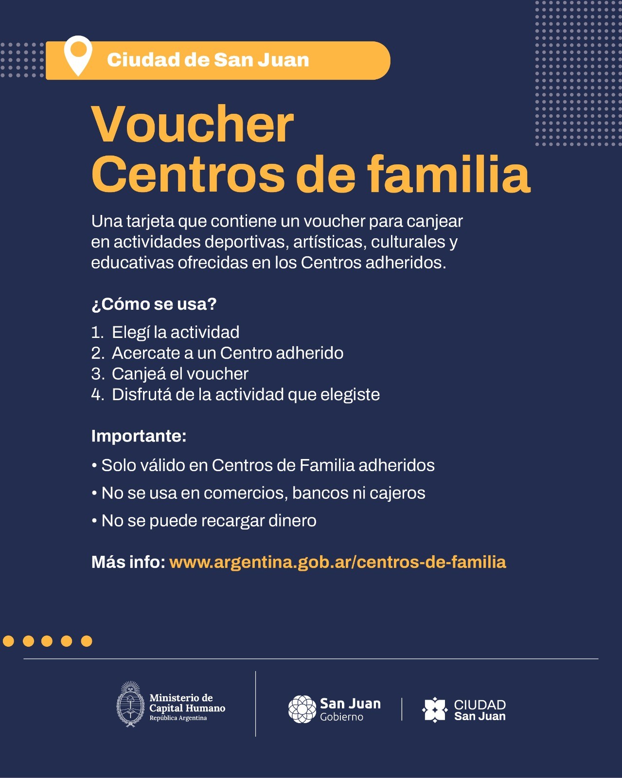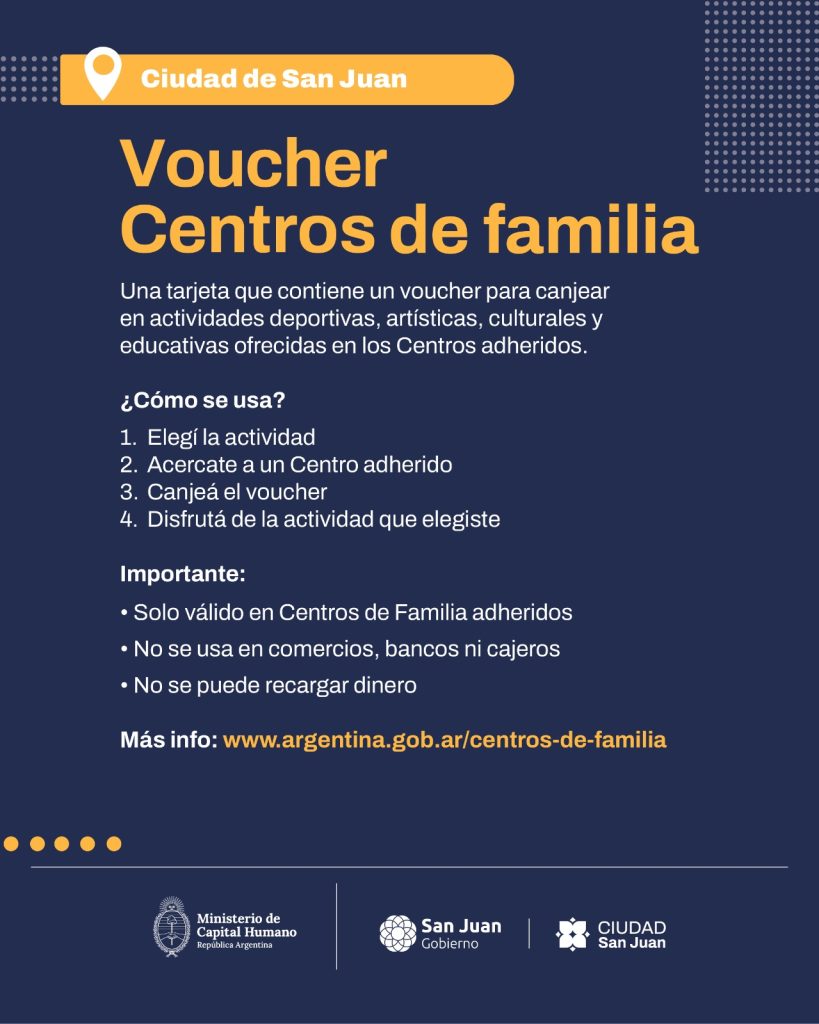 Como parte del beneficio, las personas inscriptas recibirán un voucher a través de una tarjeta física no bancaria precargada con un monto de $24.000, que permitirá acceder a las propuestas en los Centros de Familia adheridos. Este voucher no puede utilizarse en comercios, bancos ni cajeros, ni admite recarga de dinero.