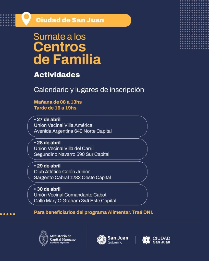 La Municipalidad de la Ciudad de San Juan comunica que se encuentra abierta la inscripción a una nueva edición del Programa Centros de Familia, una iniciativa del Ministerio de Capital Humano de la Nación, destinada a promover el desarrollo integral de niños, niñas y adolescentes de entre 6 y 17 años, junto a sus familias.