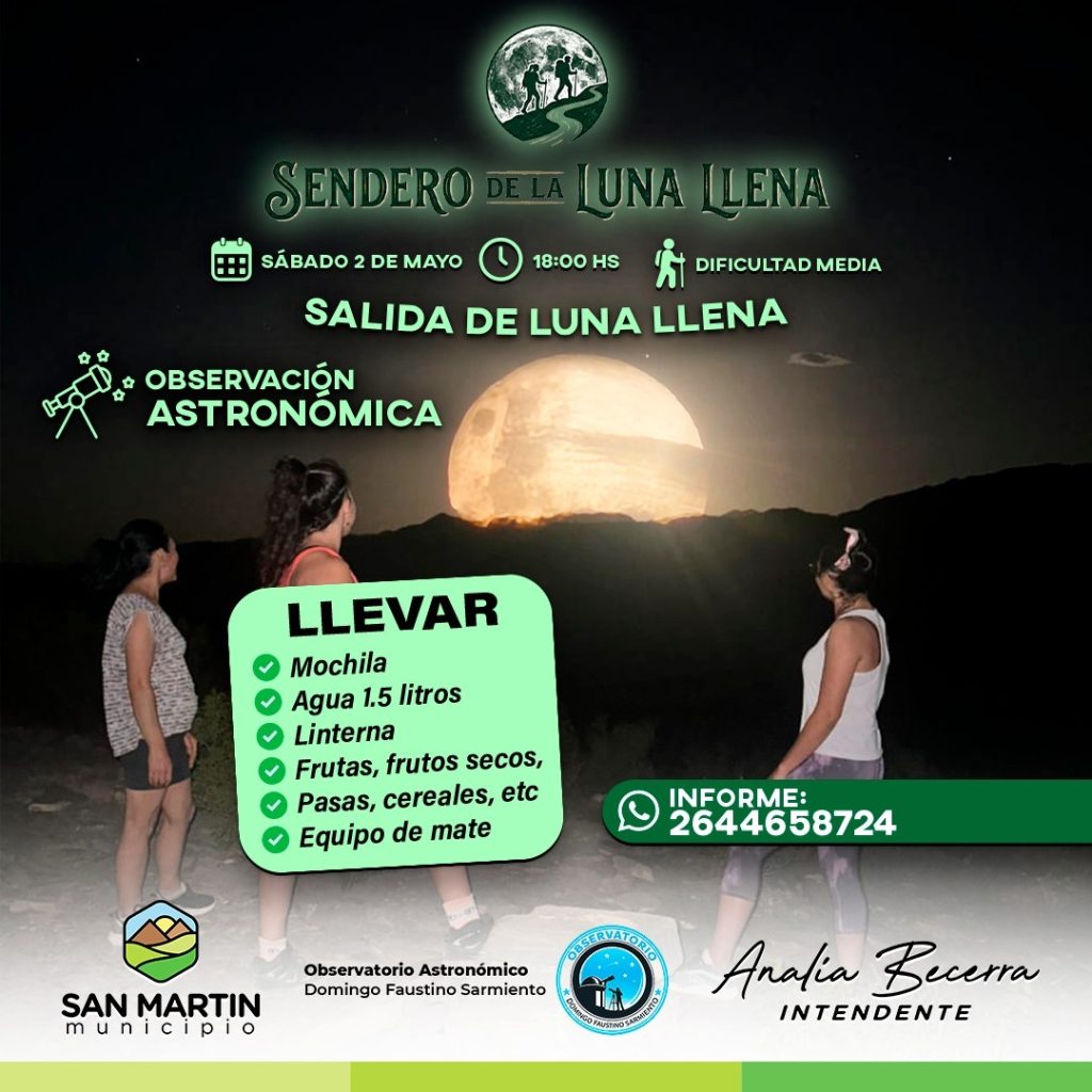 La Municipalidad de San Martín invita a participar de una nueva edición del Sendero de la Luna Llena, una propuesta que une caminata, naturaleza y observación astronómica en un entorno privilegiado.